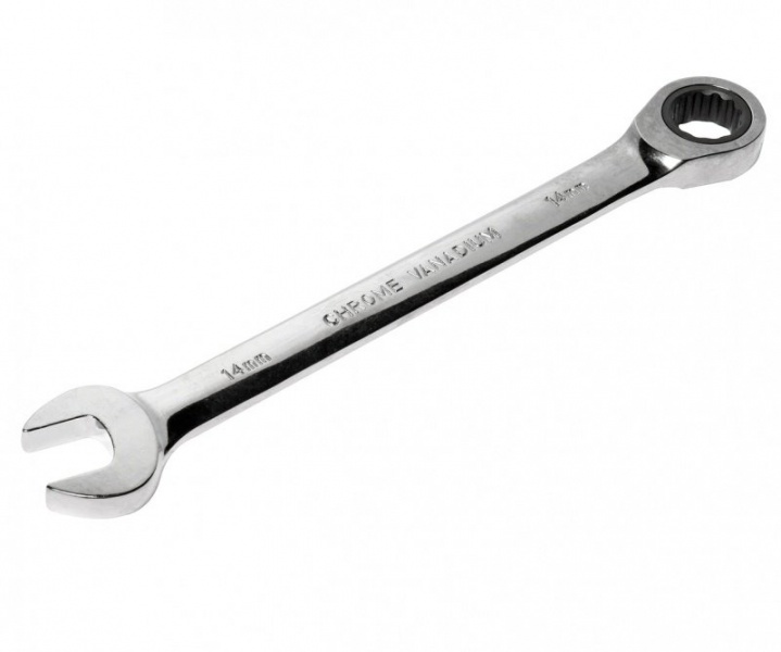 Ключ комбинированный трещоточный 14мм. Предназначен для проведения ремонтных работ автомобиля. Ключ сделан из прочной хром-ванадиевой стали с зеркальной полировкой. Ключ обладает уникальным 72-зубцовым механизмом, обеспечивающим высокий крутящий момент. Угол перемещения механизма в 5° позволяет использовать инструмент в узких и труднодоступных местах автомобиля.