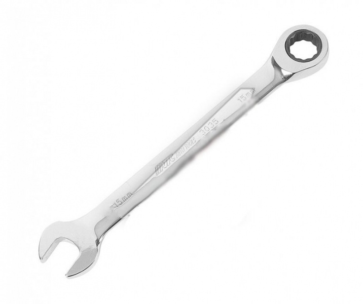 Ключ комбинированный трещоточный 15мм. Предназначен для проведения ремонтных работ автомобиля. Ключ сделан из прочной хром-ванадиевой стали с зеркальной полировкой. Ключ обладает уникальным 72-зубцовым механизмом, обеспечивающим высокий крутящий момент. Угол перемещения механизма в 5° позволяет использовать инструмент в узких и труднодоступных местах автомобиля.