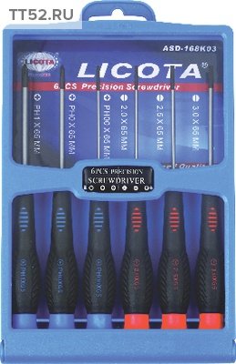 Набор отверток для точной механики ASD-168K03. Кол-во предметов 6 шт. Тип отвертки Для точной механики. Рабочий профиль SL (прямой), PH (крест). Вес 0.35. 3 - Крест: PH00 х 65 мм, PH0 х 65 мм, PH1 х 65 мм. 3 - Шлиц: SL2.2 х 65 мм,SL2.5 х 65 мм, SL3.0 х 65 мм.