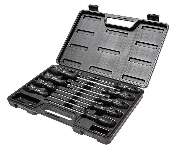 Набор отверток TORX T8х100мм-T40х150мм 9шт. Инструменты изготовлены из хром-молибденовой стали, все стержни закаленные, с намагниченными наконечниками. Предназначен для работы с винтами типа TORX. Упаковка: прочный переносной кейс.